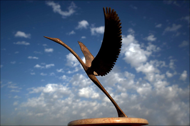 'Bird Take Off' by Hagar. 53 cm x 53 cm x 60 cm. Cast Bronze. © 2026